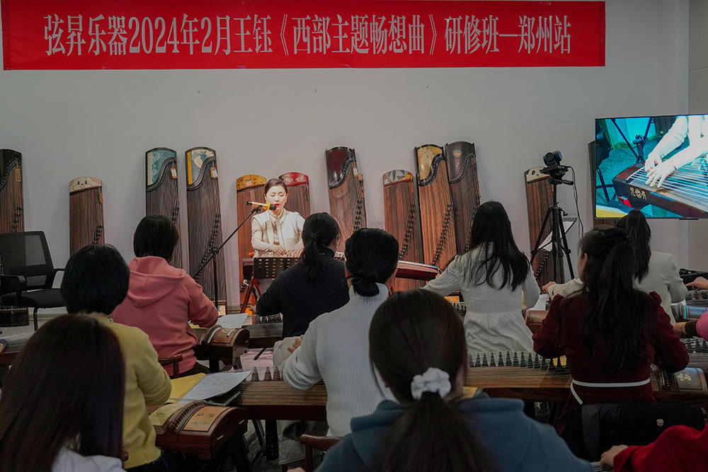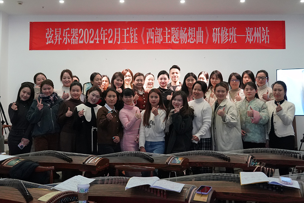 2024年2月27日,由弦昇樂(lè)器主辦、為期4天的王鈺《西部主題暢想曲》研修班-鄭州站如期舉行。本期研修班的主講人,不僅有金鐘獎(jiǎng)、文華獎(jiǎng)獲得者王鈺,而且還有她自己經(jīng)常合作的打擊樂(lè)手高童。王鈺的教學(xué)用箏為弦昇在2023年開發(fā)的老紅木古箏-唐徽,學(xué)員用箏有弦昇的闊葉檀、黑酸枝、黑檀等系列古箏。